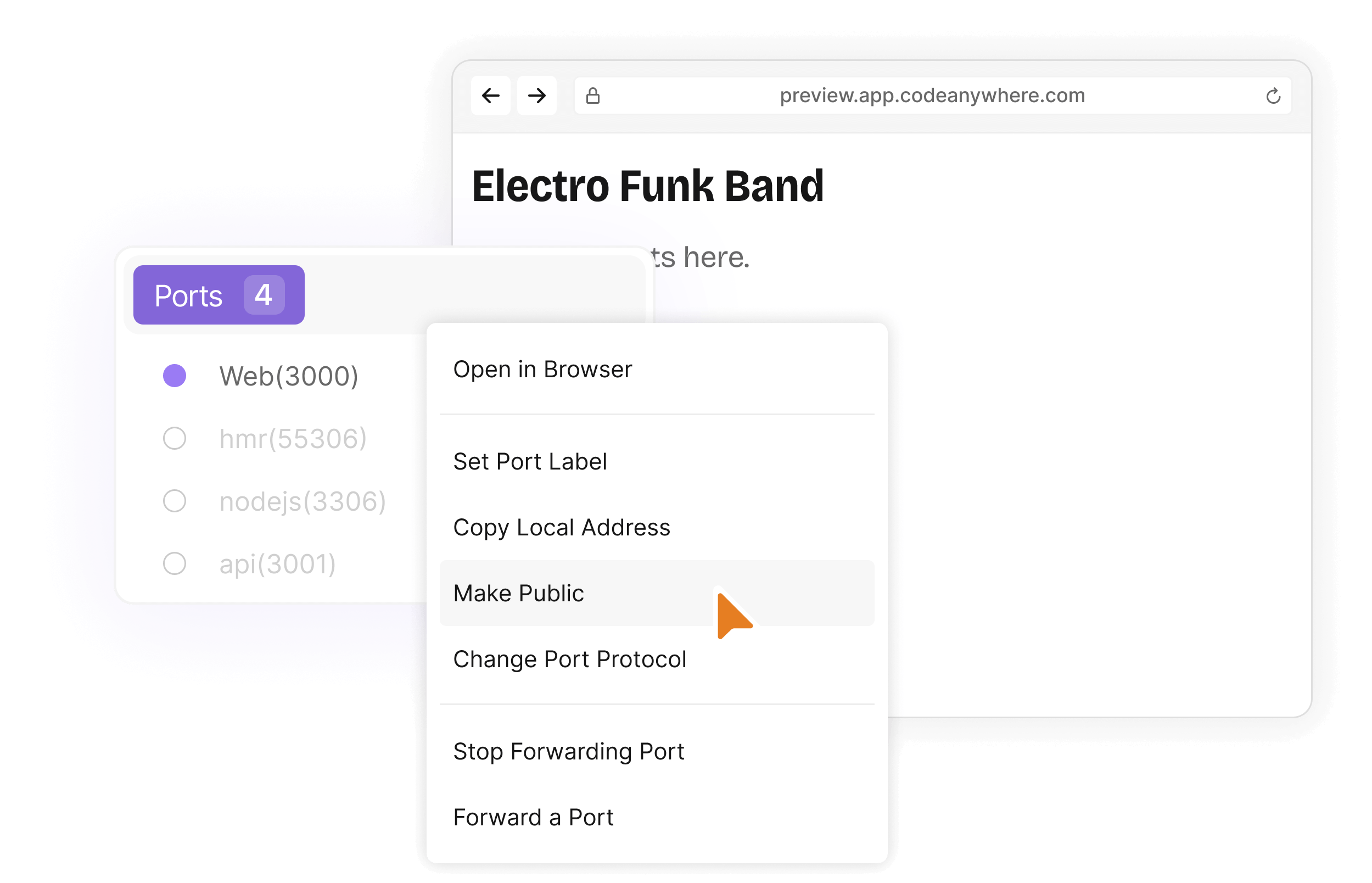 Preview your changes and get feedback from teammates by sharing ports within the scope allowed by policy. Quickly share your prebuilt development environments to your team or a class.